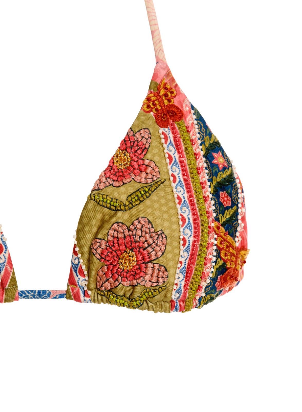 BIKINI VERDE Y ROSA CON DETALLES DE FLORES BORDADO ARTESANAL